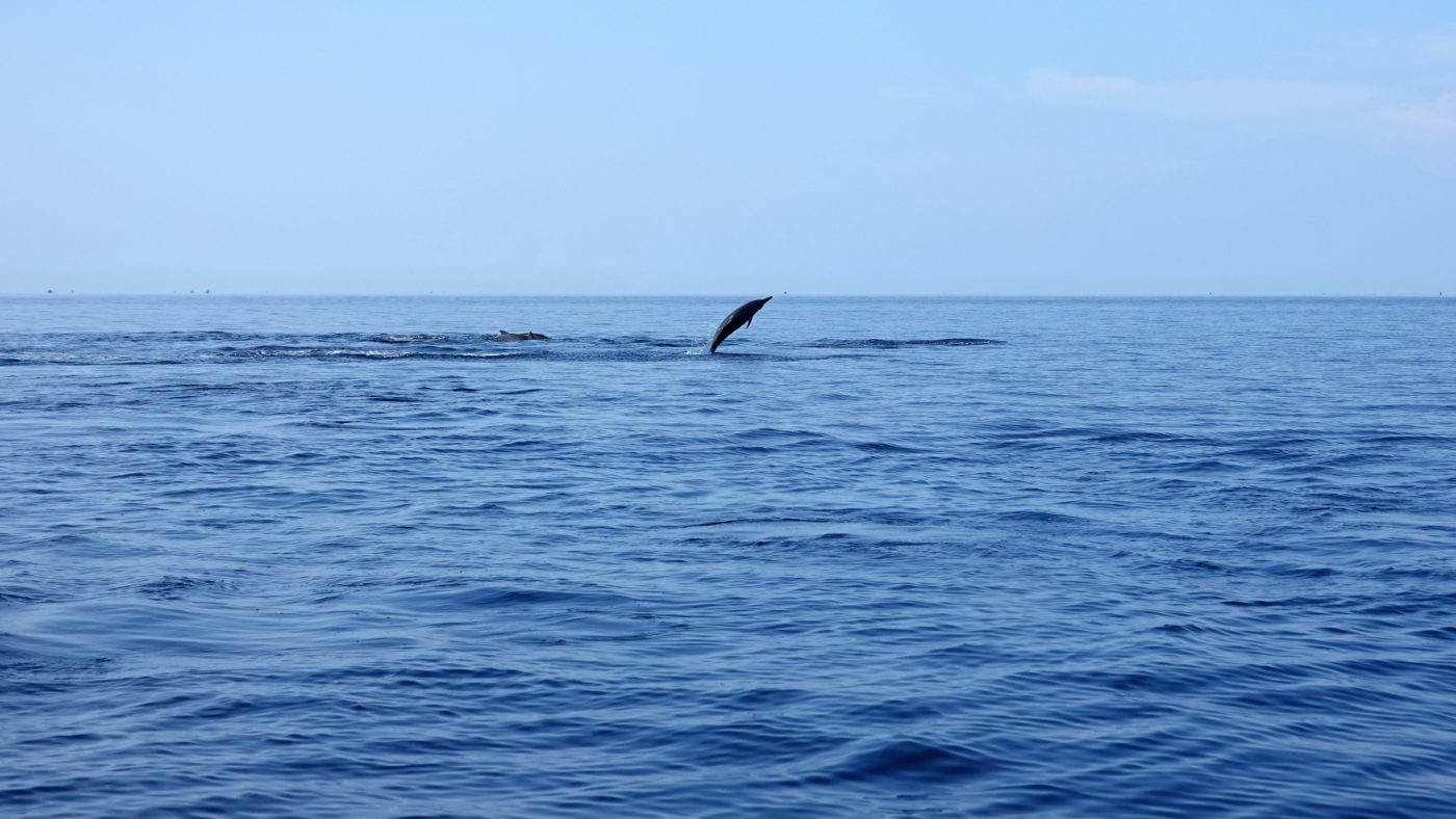 … hatte ich den Dreck satt und bin stattdessen mal mit dem Boot zu einem Tauchgang am südwestlichen Rand der Ambon-Bucht mitgefahren. Schon kurz nachdem wir losfuhren begegneten wir einer großen Schule Delfine.